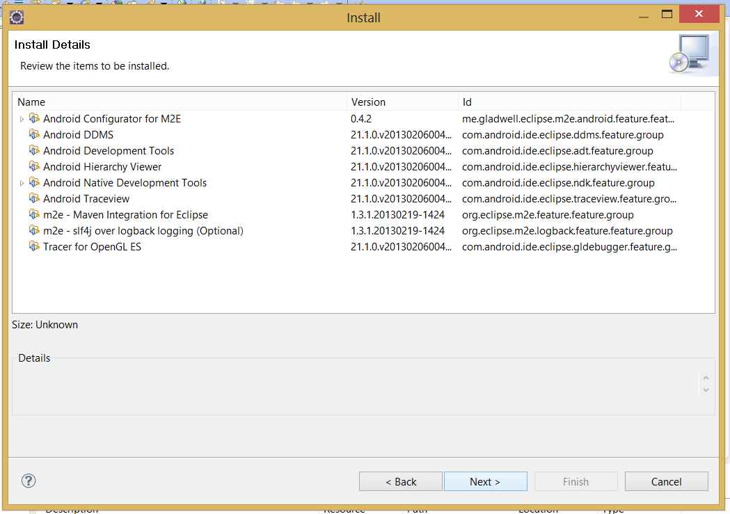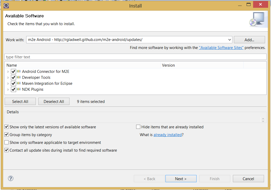 Em name adicione os termos “m2e Android” e em location adicione a URL http://rgladwell.github.com/m2e-android/updates/ clique em OK. Após alguns segundos aparecerá uma tela semelhante a imagem abaixo. Selecione todos e clique em Next.