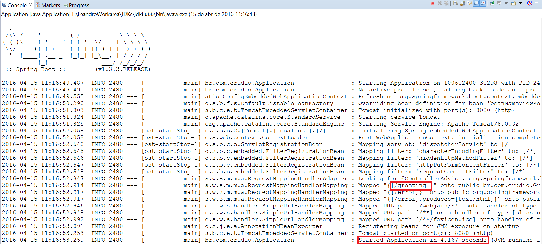 Se você tiver feito tudo corretamente terá um console parecido com a imagem abaixo observe que o endpoint /greeting foi mapeado e que nossa aplicação iniciou em apenas 4 segundos.