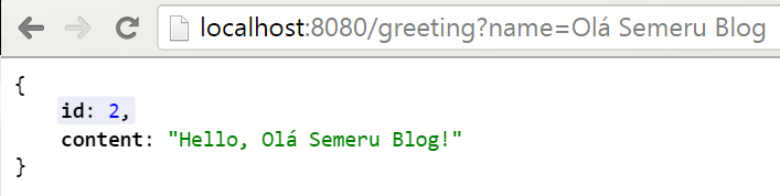 Agora adicione um parametro a mais a nossa url localhost:8080/greeting?name=Olá Semeru Blog ou outro parametro de sua preferência e terá uma resposta similar à imagem abaixo.